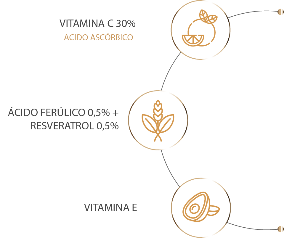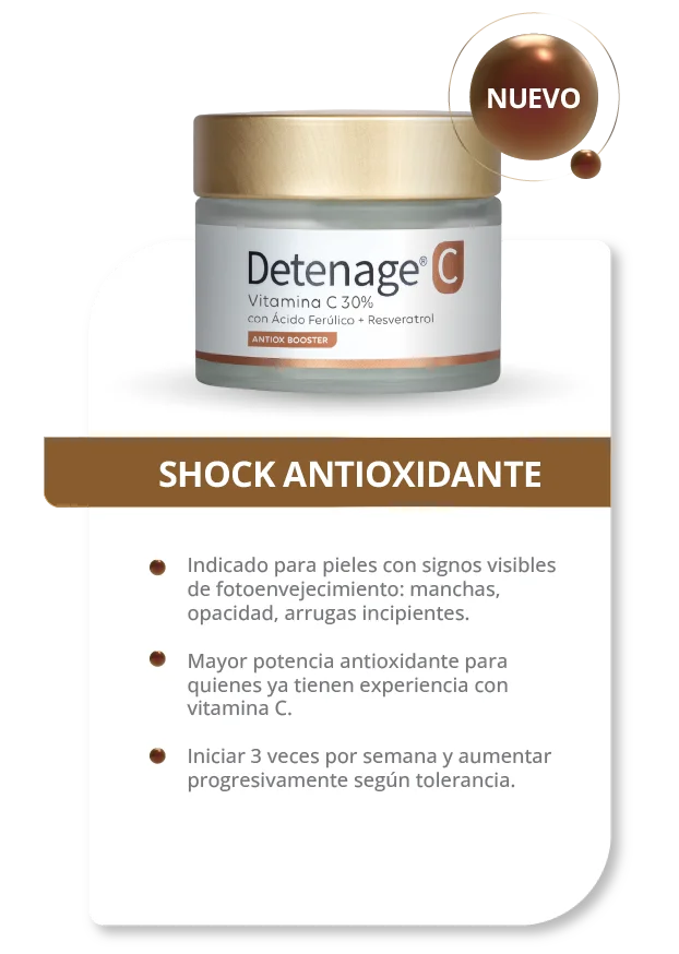 Detenage C 30%, potenciada con Ácido Ferúlico, Resveratrol y Vitamina E, ofrece un shock antioxidante intensivo para pieles con signos visibles de fotoenvejecimiento como manchas, opacidad o arrugas incipientes. Su sinergia de alta potencia unifica el tono, potencia la luminosidad y refuerza la defensa antioxidante de la piel.