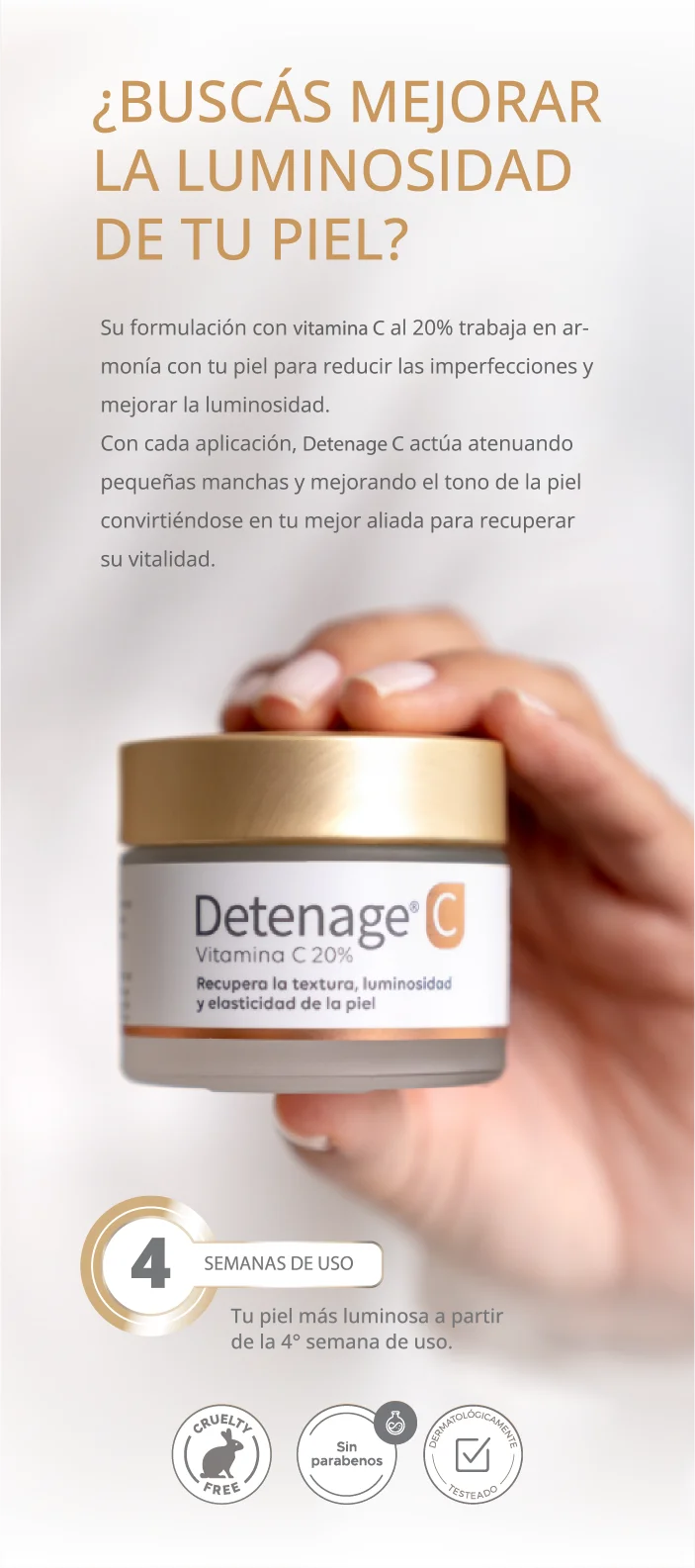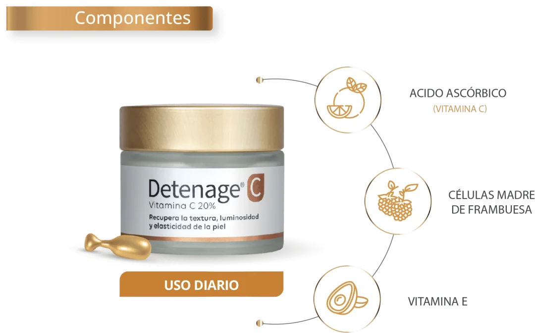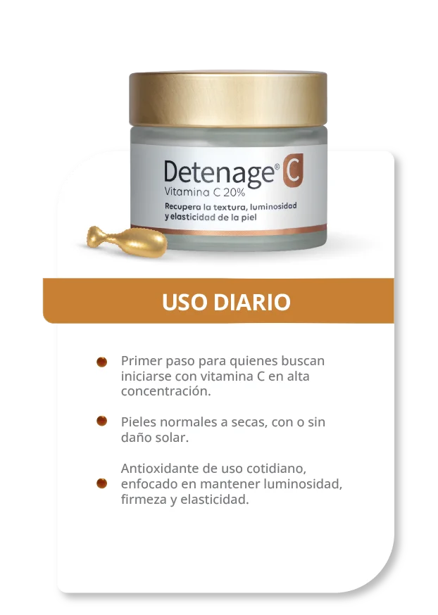 Detenage C 20%, potenciada con Vitamina E y Celulas madre de frambuesa, indicada para uso diario, es el primer paso ideal para quienes buscan iniciarse en altas concentraciones de Vitamina C. Ayuda a mantener la luminosidad, la firmeza y la elasticidad, actuando como un antioxidante cotidiano de alta calidad.