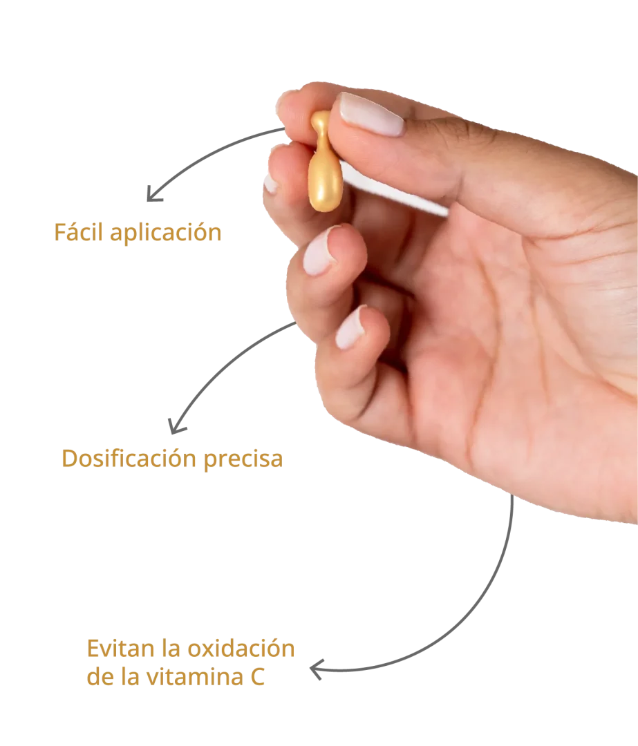 Formato monodosis en cápsulas twist off que protege al producto de la oxidación, formulada con Vitamina C pura y estable, disponible en dos concentraciones: