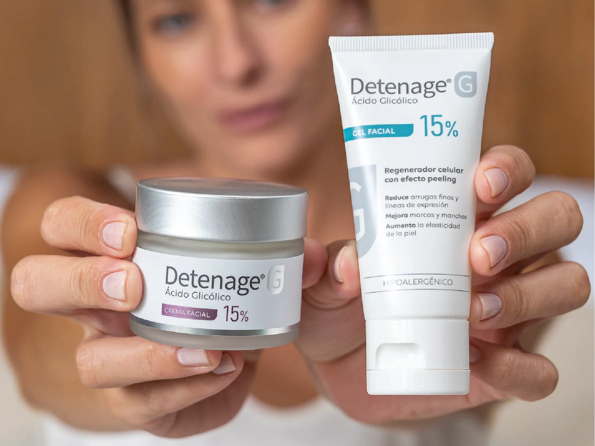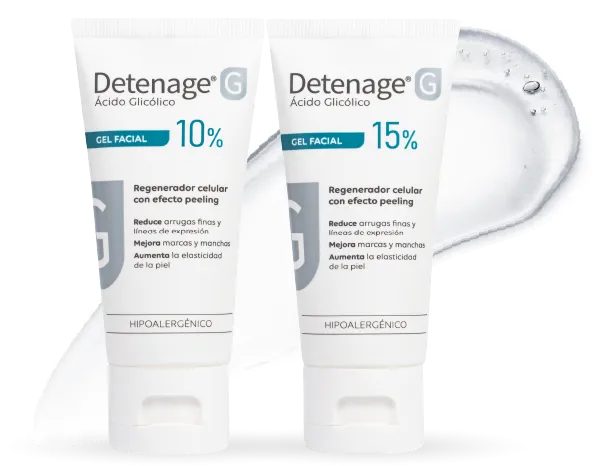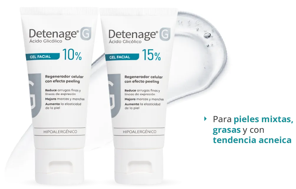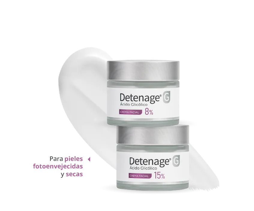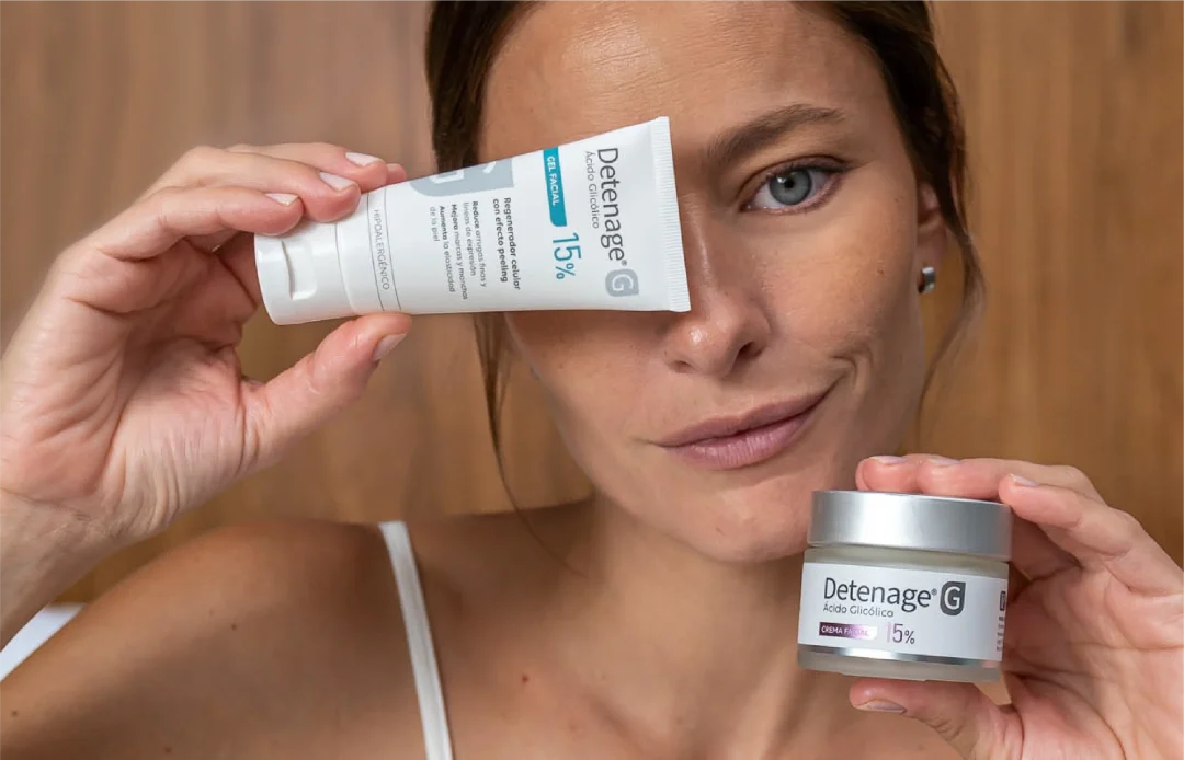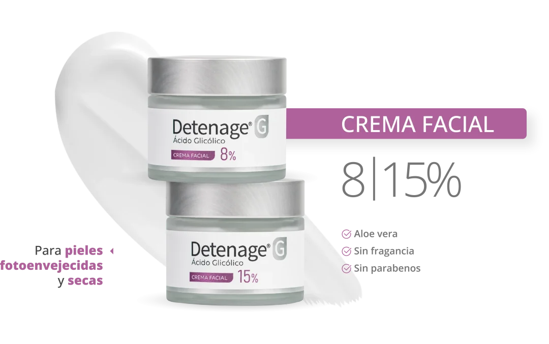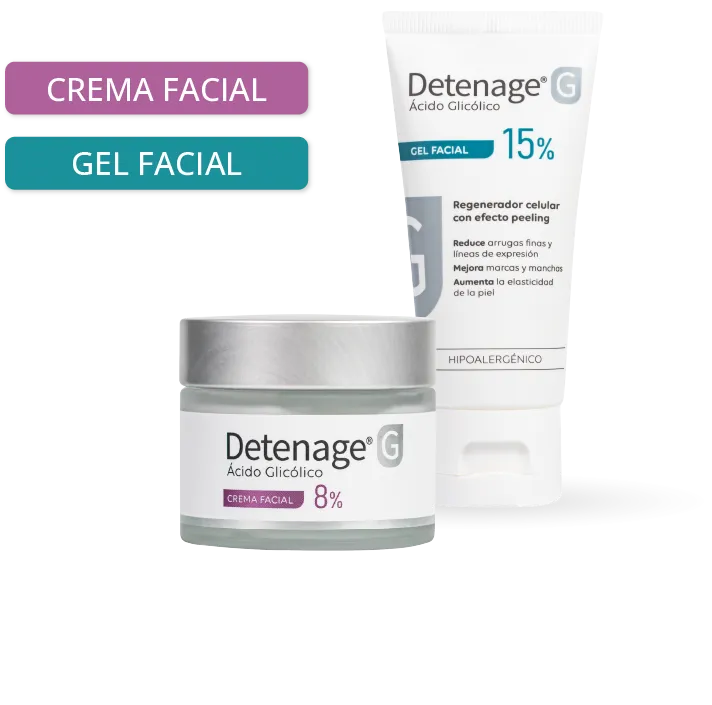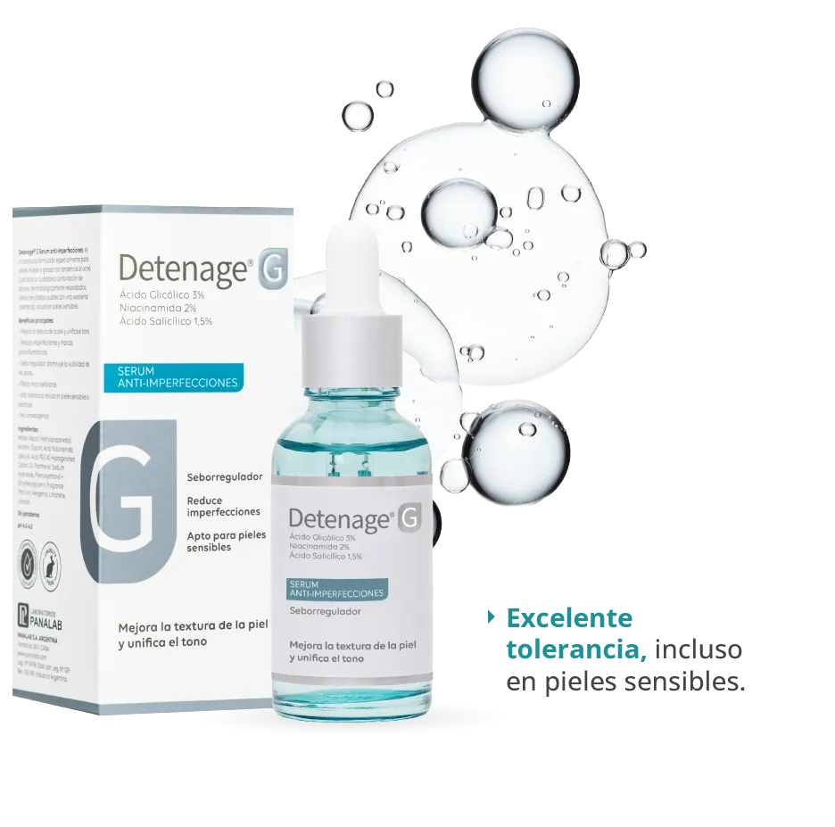 La línea se completa con Detenage® G Serum Anti-Imperfecciones, ideal para pieles mixtas a grasas o con pequeñas imperfecciones, con Ácido Glicólico al 3%, Niacinamida 2% y Ácido Salicílico 1,5%, en una fórmula de triple acción: exfolia suavemente favoreciendo la renovación celular, regula el exceso de sebo y ayuda a mantener la hidratación, con una excelente tolerancia incluso en pieles sensibles.